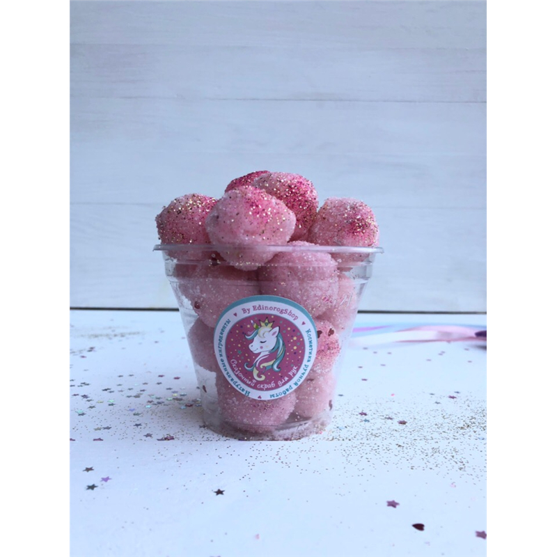 Сахарный скраб ручной работы для рук и тела с блестками и ароматом свежей, сочной клубнички. Скрабик выполнен в форме вкусных конфеток для удобства применения. Нежно отшелушившее кожу, придает ей мягкость благодаря маслам входящим в его состав.